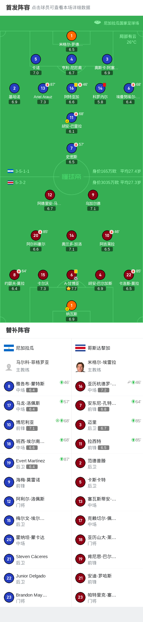 北京时间9月6日世界杯中北美洲区预选赛 第三阶段,尼加拉瓜对阵哥斯达黎加。尼加拉瓜博尼利亚破门。哥斯达黎加A-甘博亚破门。最终比分尼加拉瓜 1-1 哥斯达黎加。